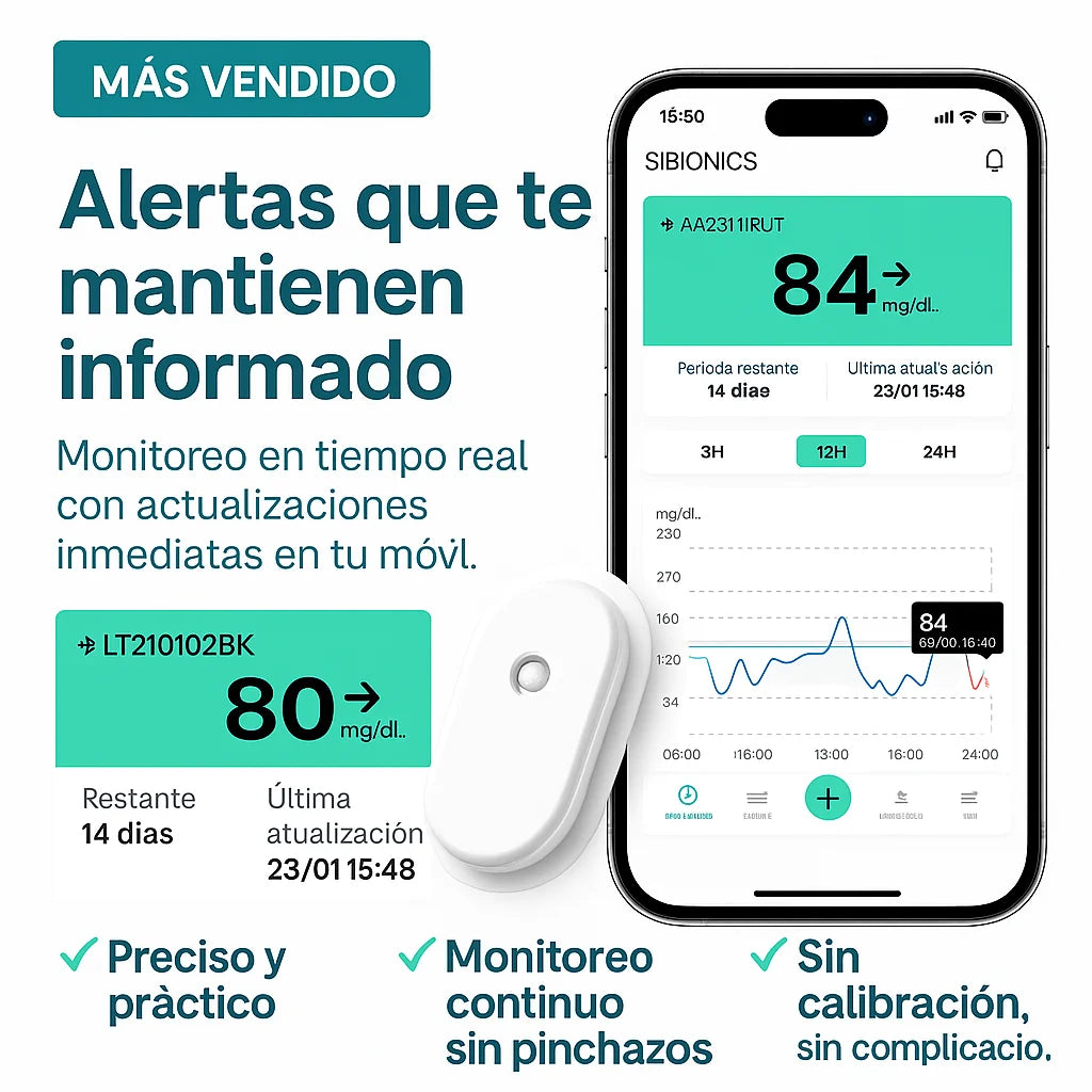 La app SIBIONICS es potente y lo suficientemente sencilla para que tengas control total sobre tu salud. Monitorea datos diarios y exporta informes AGP; registra comidas y actividades; configura alarmas y recordatorios; comparte datos con familiares y amigos.